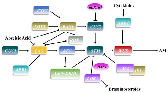 MERISTEMLESS (STM) is another important factor for maintaining branch organization. STM, a KNOX gene, is expressed in the whole SAM but is excluded from the organ primordium that maintains the function of undifferentiated cells in the SAM [15]. The molecular markers of the AM include concentrated and strong expression of STM in the center of the boundary region [16]. Once cells begin to differentiate, STM is downregulated by the MYB family transcription factor ASYMMETRIC LEAVES1 (AS1) and the LBD family transcription factor AS2 [17]. This indicates that the cells in the border region maintain the ability to recover to the meristem stage within a limited period of time. During the developmental stage, AMs began to form [18].