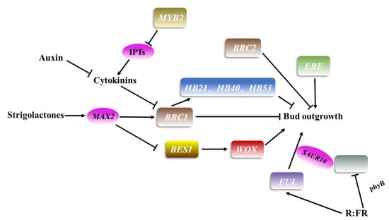 The transcription factor BRANCHED1 (BRC1) in Arabidopsis is homologous to TEOSINTE BRANCHED 1 (TB1) in maize and plays a core inhibitory role in regulating axillary bud growth (Figure 3). BRC2 is a paralog of BRC1, which is also expressed in axillary buds and plays a redundant role in the regulation of axillary bud growth [43]. Similarly, VvBRC plays a key and negative role in branching in grape [58]. LAS and REV act upstream of BRC1. As expression of BRC1 is significantly downregulated in the max2 mutant, the MAX-mediated pathway seems to control the activity of BRC1 [59]. Homeobox 21 (HB21), HB40 and HB53 act directly downstream of BRC1 to regulate branching [60]. Moreover, BRC1 was identified as an inhibitor of downstream branches of SL signal transduction [61,62]. SL, a plant hormone synthesized by carotenoid catabolism, moves from root to stem, inhibiting stem branching by preventing the growth of axillary buds [63]. In Arabidopsis, another transcription factor involved in the SL pathway, namely, BRI1-EMS-SUPPRESSOR1 (BES1), negatively regulates cambium activity in the SL signaling pathway. Further studies have shown that SL signaling regulates the expression level of WOX4 through BES1, controlling secondary growth [64]. CK is another class of hormones that has an important role in regulating apical dominance and axillary bud outgrowth. At the later stage of development, MYB2 reduces the concentration of CK by inhibiting the expression of IPTs, suppressing the growth of axillary buds [47]. In functional exploration of the MADS domain factor FRUITFULL (FUL) in Arabidopsis thaliana, it was found that the combination of auxin and BR strongly induced the growth regulator SMALL AUXIN UPREGULATED RNA 10 (SAUR10) to be directly modulated by FUL, thus participating in branching angle regulation [65]. It should be noted that FUL also responds to a decrease in R:FR light by regulating the SAUR10 pathway and affecting Arabidopsis branching [65]. The auxin-regulated branching pathway in Arabidopsis involves a class of photochrome-targeted transcription factors, PHYTOCHROME INTERACTING FACTOR 4 (PIF4)/PIF5 [66]. When these transcription factors participate in photoreactions, they inhibit the branching caused by phyB dysfunction and low R: FR. Hence, R:FR plays an important role in branching.