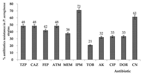 Antibiotic susceptibility was evaluated by the disc-diffusion method. The results showed high levels of antibiotic resistance in the analyzed P. aeruginosa strains. Antibiotic resistance to piperacillin/tazobactam (TZP) was encountered in 48% of the analyzed strains, ceftazidime (CAZ) in 48%, cefepime (FEP) in 42%, aztreonam (ATM) resistance was observed for 48% of the P. aeruginosa strains, meropenem (MEM) in 38%, imipenem (IPM) in 71%, tobramycin (TOB) in 21%, amikacin (AK) in 32%, ciprofloxacin (CIP) in 33%, doripenem (DOR) in 33%, and Gentamicin (CN) in 48%, as shown in Figure 1.