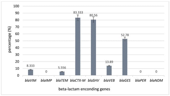 Indeed, the molecular investigation of the genes encoding for antibiotic resistance revealed that the most frequently encountered encoding genes were for extended spectrum β-lactamases (ESBLs), namely, blaCTX-M (n = 30 strains), blaSHV (n = 29 strains), blaGES (n = 19 strains), and blaVEB (n = 5 strains), followed by carbapenemase-encoding genes (blaVIM, n = 3 strains) (Figure 3).