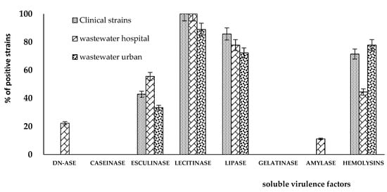 Regarding their virulence profile, the evaluation of soluble virulence factors showed that most of the P. aeruginosa strains expressed pore forming enzymes, such as hemolysins, lipase, and lecithinase. The distribution of virulence factors seems to be unrelated to the isolation source of analyzed P. aeruginosa strains (Figure 3). In addition, about 50% of the analyzed strains showed the ability to degrade esculin in vitro (Figure 3), and this phenotype could be related to the ability of these strains to acquire iron and produce siderophores [29]. Although not significant, some modifications in the distribution of soluble virulence factors were observed among P. aeruginosa strains, depending on their isolation source. Generally, clinical and hospital wastewater isolates showed a higher percentage of positive strains as compared to urban wastewater isolates (Figure 4). Differences in virulence characteristics of microbial strains isolated from various sources were also reported in earlier studies, and they may be explained by strain diversity during infection in particular hosts [30,31].