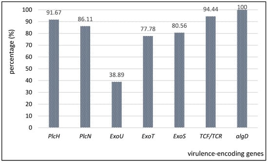 Regarding the distribution of virulence markers in clinical and wastewater P. aeruginosa strains, the molecular analysis showed that 100% of the strains were positive for alginate-encoding gene and 94.44% for protease IV (TCF/TCR); the greatest part of the investigated strains were exotoxin producers (i.e., 80.56% for exoS gene, 77.78% for exoT gene, while the exoU gene was present only in 38.98% of the strains). Phospholipase-encoding genes (plc) were revealed as follows: plcH in 91.67% and plcN in 86.11% of the analyzed strains (Figure 5).