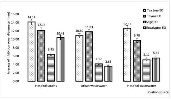 The qualitative analysis revealed that the large diameter of the inhibition zone was observed in cases of tree tea EO, followed by thyme EO regardless of isolation sources (Figure 6).