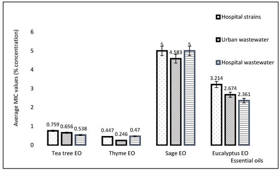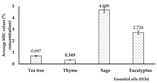 The results gave various MIC values, depending on the analyzed EO, being influenced also by the isolation source of the P. aeruginosa strains. Generally, the lowest MIC values were obtained for thyme and tea tree EOs in the tested P. aeruginosa strains, regardless of their isolation source. The average value of the minimum concentration of tea tree was 0.697%; for thyme it was 0.349%, for sage it was 4.688%, while for eucalyptus, it was 2.726%, as shown in Figure 7.