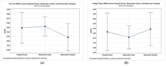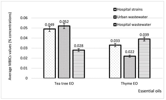 When comparing the MBIC values of the two tested essential oils with the origin of P. aeruginosa strains, the results showed that the average value of tea tree was in the range of 0.028–0.052%, and that of thyme was in the range of 0.022–0.039%, as Figure 11 reveals.