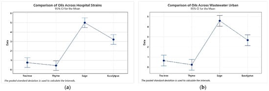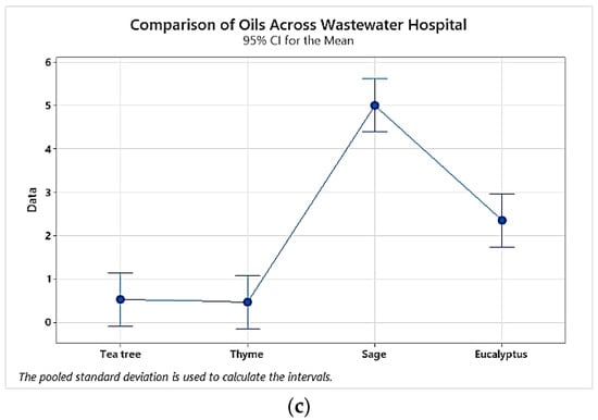 Charts showing comparison of the MIC values for the tested EOs among P. aeruginosa strains isolated from different sources: (a) comparison of EO MICs across hospital strains, (b) comparison of EO MICs across wastewater hospital, (c) comparison of EO MICs across wastewater urban; p < 0.05 when comparing average MICs of thyme or/and tea tree EOs to sage or/and eucalyptus.