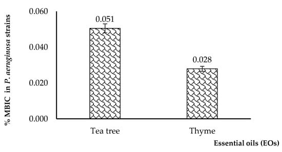 However, overall biofilm inhibition efficiency was higher for thyme EOs, since the average MBIC for this oil was significantly lower than the average MBIC obtained for tea tree in the evaluated P. aeruginosa strains (Figure 13).