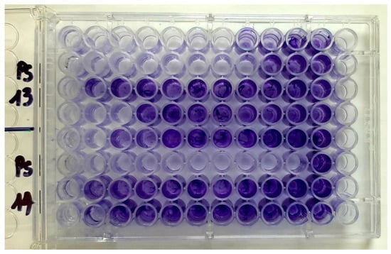Aspect of 96 well plates after CV staining in cases of 2 P. aeruginosa strains treated with EOs (last column (12)—sterility control, the row before (11)—growth control).
