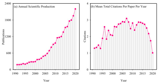 The annual circulation of publications can reflect the research progress and its importance of ST to some extent. The overall trend of the literature showed that the number of publications increased during 1991–2020 (Figure 1a). We also found that the total number of research papers on ST was very large, which indicates that ST research expanded during the past thirty years. The number of studies increased nearly 12 times, from 178 in 1991 to 2201 in 2020, with an average annual growth rate of 9.1%. After 2001, there was a significant increase, and nearly 90% of the publications were published between 2001 to 2020. The increase trend of ST-related publications was consistent with that of the global scientific publications [29]. On the other hand, ST have received less attention historically and are now growing in attention, and there are still many unsolved scientific problems.
