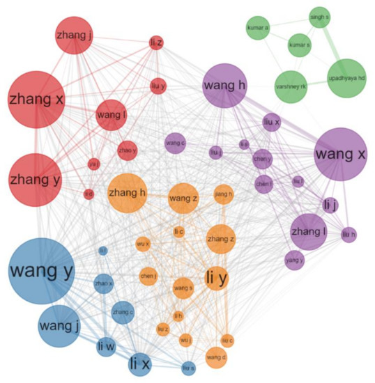 Figure 2 shows the collaboration network of the productive authors. The size of the circle indicates the number of publications published by the author, and the connection between authors indicates the intensity of cooperation. By analyzing the cooperation network of the high-yield authors, we can quickly grasp the main research teams in the field. It is not difficult to find that Chinese authors rarely cooperate with national and international scientists, as they are divided into several teams. This may be one of the reasons why none of these authors were the most cited authors. Wide collaboration is an effective way to advance the development of science.