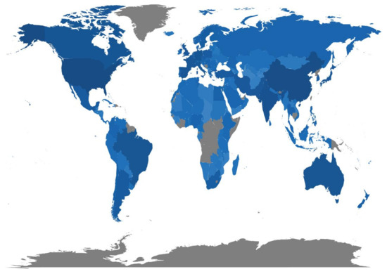 Country scientific production. The color intensity is proportional to the number of publications in ST studies.