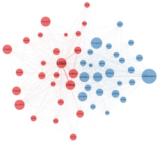 We produced an author collaboration and a country collaboration network. The size of the circle represents the production of the author/country. The larger the circle is, the higher production rate the author/country has. The lines between two circles indicate the relationships between two authors/countries. The thicker the line is, the closer the relationship the two authors/countries have. Different colors represent different clusters, indicating that these authors/countries are more likely to appear in the same publication [30].