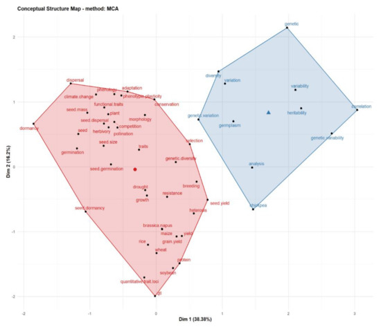 The Bibliometrix R-package allows multiple correspondence analysis (MCA) to be performed, using the conceptual structure function to plot the conceptual structure of the fields, and K-means clustering is used to identify the document clusters that express common concepts. The results are interpreted based on the relative position of the points and their distribution along the dimensions. The more closely related the keywords are, the more they will be in a cluster or grouping.