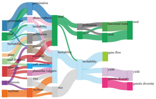 The time span is divided into different time segments, and the evolution trend of topics in a specific study area can be represented by the alluvial graph [30]. The time evolution of all of the keywords in ST research showed that the most used keywords have changed significantly in the research process. “Germination” was a research hotspot in the 1990s, while “yield” was a research hotspot in the 2010s. The popular keyword “heritability” flourished between 1991–2010 and then evolved in three main directions: gene flow; yield; and genetic diversity.