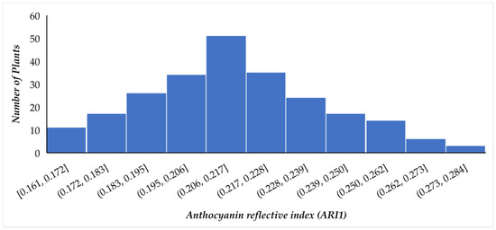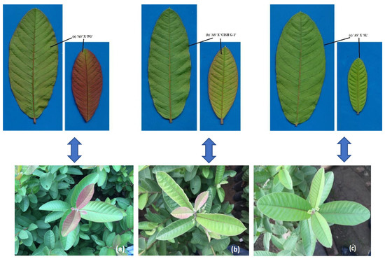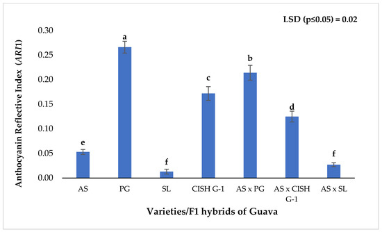 Quantitatively, guava parent ‘PG’ has the highest Anthocyanin Reflective Index (ARI1) content (0.266) and this was closely followed by their F1 hybrids, having ARI1 content of 0.214. The ARI1 content of F1 hybrids of ‘AS’ × ‘CISH-G1′ was closest to that of the male parent ‘CISH G-1′, whose ARI1 content was 0.172 (Figure 3). The lowest ARI1 content was recorded in parent ‘SL’ (0.013) and their derived progeny ‘AS’ × ‘SL’ (0.027). This clearly depicted the movement of colour-changing pigment traits during the crossing of guava crop and there was no sign of colouration in green coloured guava cultivars. The newly developed F1 hybrids from both cross combinations ‘AS’ × ‘PG’ and ‘AS’ × ‘CISH G-1′ exhibited morphological changes and reflected a purple and light pink colouration on their younger leaves [Figure 1a,b], whereas there was a green colouration on the younger leaves of cultivar ‘SL’ and their F1 progeny ‘AS’ × ‘SL’ [Figure 1c]. These results are in keeping with a view of complicated morphological properties and the fact that our understanding of the contribution of all the pigment colouration is not yet sufficient. However, considerable progress was made and non-destructive techniques for better assessment of pigments in plant leaves [34,35,36,37,38,39,40] were developed. In earlier studies, the (ARI1 content) anthocyanin absorption induced a dramatic decrease in reflectance in the green region of the spectrum [41]. All the guava parents (AS, PG, SL, CISH G-1) and their F1 populations were provided with equal conditions such as light, irrigation and other capital needs which could affect them during this study programme.