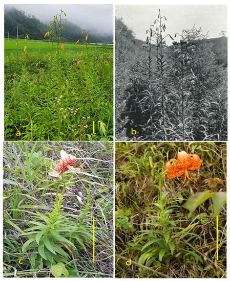 L. leichtlinii morphology in native habitats in Korea and Japan. (a). Wonju, Kangwon-do, Korea. (b). North Korea []. (c). Ishiji, Niigata, Japan. (d). Ikistuki, Hirado, Japan. Bars indicate 20 cm.