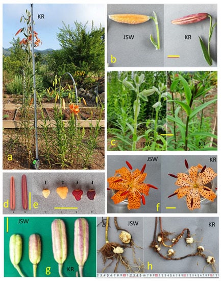 Comparison of KR and JSW L. leichtlinii. (a). Plant height of representative KR and JSW L. leichtlinii in germplasm field. (b). Bud morphology. (c). Stem color and hairs on the shoots and flower bud. (d). Anther color of JSW (a) and KR (b) plants. (e). Stigma color of JSW (#1) and KR plants (#2-4). (f). Flower morphology. (g). Fruit size. (h). Size of fully developed stolons. Scale bar of (b,c,f) = 2 cm; (d,e,g) = 1 cm.