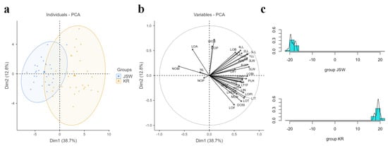 Linear discriminant analysis produced results that were consistent with the PCA (Figure 4c). These results indicate that various traits could be used to distinguish between the JSW and KR groups.