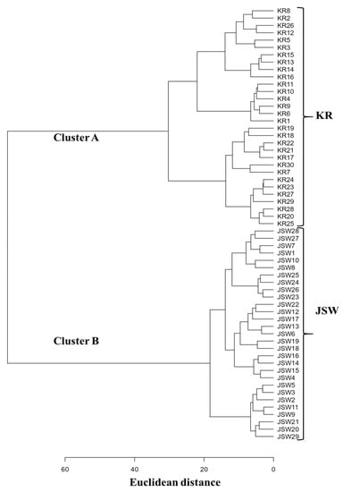 Hierarchical cluster analysis based on 36 morphological characteristics of two L. leichtlinii groups: KR and JSW. KR and JSW accessions showed distinct separation from each other, as KR L. leichtlinii accessions grouped into cluster A and JSW accessions into cluster B.