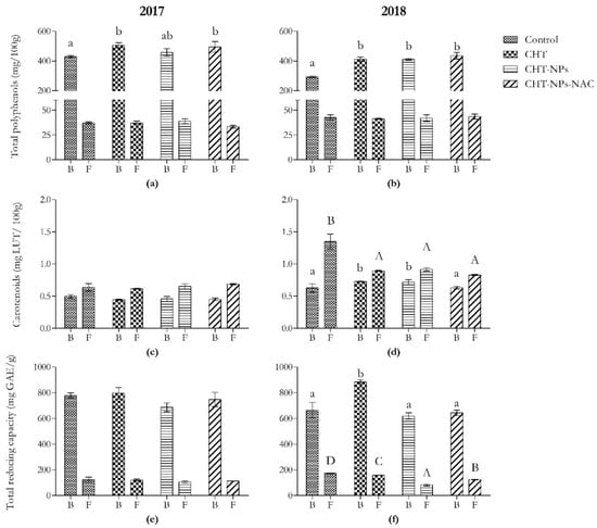 Content of total polyphenols, carotenoids, and total reducing capacity in bran and semolina obtained from Triticum durum (cv. Fabulis) in 2017 (a,c,e) and 2018 (b,d,f), untreated (Ctrl) or treated with CHT, CHT-NPs, or CHT-NPs-NAC. Bars represent mean ± standard deviation (n = 3). Different uppercase and lowercase letters indicate significant differences among treatments in bran and semolina, respectively, according to Tukey’s post-hoc test.