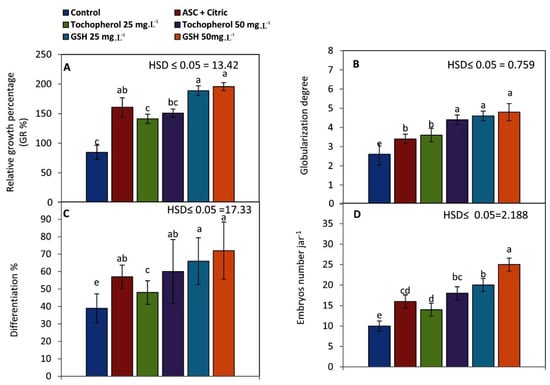 The influence of antioxidants added to date palm maturation media on: (A) relative growth% of embryogenic callus, (B) globularization degree, (C) differentiation% of early stage somatic embryos, and (D) SEs number. Bars represent the means of five replicates ± standard deviation; Different letters (a–e) indicate significant differences according to Tukey’s Studentized Range (HSD) test (p ≤ 0.05).