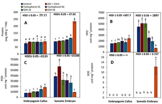 The effect of different antioxidants added to the date palm maturation media on: (A) protein concentration (mg/100 g FW), and the specific activities (unit mg−1 protein) of (B) polyphenol oxidase (PPO), (C) peroxidase (POD), and (D) superoxide dismutase (SOD) within competent embryogenic callus (EC) and fully developed SEs after eight weeks of treatment. Bars represent the means of five replicates ± standard deviation; Different letters (a–c) indicate significant differences according to Tukey’s Studentized Range (HSD) test (p ≤ 0.05).