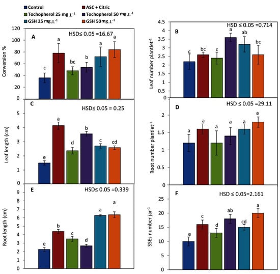 Influence of antioxidants on: (A) conversion% of SEs into viable plantlets, (B) leaves number plantlets−1, (C) leaf length (cm), (D) root number plantlet−1, (E) root length (cm), and (F) secondary embryos (SSEs) number when regenerated SEs matured previously on different antioxidants treatments and cultured on germination medium (NAA at 0.1 mg L−1 plus 0.05 mg L−1 BA). Bars represent the means of five replicates ± standard deviation; Different letters (a–e) indicate significant differences according to Tukey’s Studentized Range (HSD) test (p ≤ 0.05).