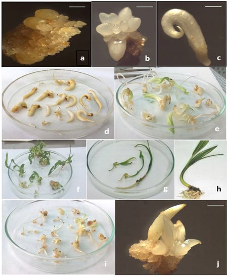 Stages of date palm somatic embryogenesis cultivar Sewi: (a) EC, (b,c) early and late stages of somatic embryos that matured on culture media contained 0.5 mg L−1 ABA, 5 g l−1 PEG-4000, 10 g l−1 phytagel and various types and quantities of examined antioxidants, (d) high quality of regenerated SEs treated with ASC and citric acid, (e) viable plantlets derived from vigor SEs previously matured on medium supplemented with GSH at 50 mg L−1, (f) SEs converted into plantlets which characterized with the highest leaves number when maturation medium was supplemented with α- tochopherol at 50 mg L−1, (g) dark green color of ASC and citric acid treated-plantlets, (h) elongation and rooting of plantlets derived from SEs previously matured on GSH at 50 mg L−1, and (i,j) highest number of secondary somatic embryos (SSEs) when original SEs were matured on GSH at 50 mg L−1. Bar; a = 0.1 cm, b = 0.25 cm, c = 0.7 cm and j = 0.5 cm.