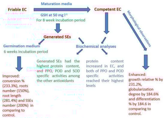 Somatic embryogenesis is the process by which somatic cells are encouraged to become more competent and switch to embryogenic cells. These cells then continue to develop and produce somatic embryos. Antioxidants especially GSH appear to have a vital role in date palm somatic embryogenesis via increasing the proliferative growth which may estimate by increasing relative growth%, as well as enhancing the development of early stage of somatic embryos. Many physiological correlations are highlighted in the current study based on protein accumulation and antioxidant enzyme activities in competent EC and fully developed somatic embryos, which are important in the development of early and late stages of SEs (Figure 5). Finally, an increase in the productivity of date palm SEs with great quantitative and qualitative features is required for the best possible conversion into plantlets.