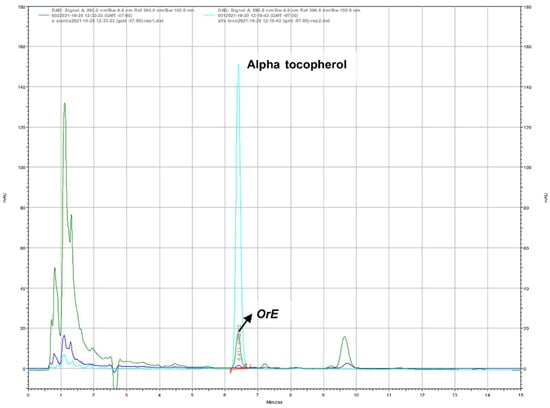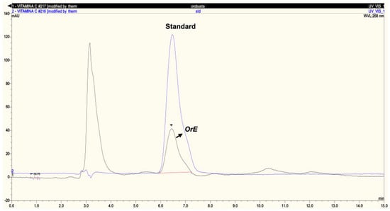 Vitamins E and C are potent antioxidants present in OrE at 429.9 μg/100 g and 141.14 mg/100 g, respectively (Figure 2 and Figure 3). The content of vitamin C was very similar to that reported for guava, a fruit known for its significant content of vitamin C (136.99 mg/100 g) [52].