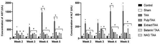 Aspartate aminotransferase (AST) and Alanine aminotransferase (ALT) concentrations for different treatments at different evaluation times. Two-way ANOVA with Tukey’s post hoc test. * p < 0.05 compared to control group, # p < 0.05 compared to thioacteamide group.