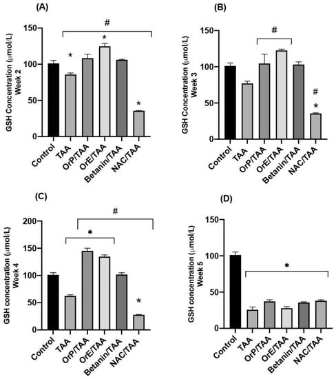 Concentrations of reduced glutathione (GSH) in liver tissue for the different treatments at different evaluation times. (A–C) OrP and OrE help to restore GSH levels. (D) A significant depletion of GSH is generated, the oxidative damage is severe in chronic treatment and hepatoprotectors have no effect at this point. One-way ANOVA with Tukey’s post hoc test. * p < 0.05 compared to control group, # p < 0.05 compared to TAA group.
