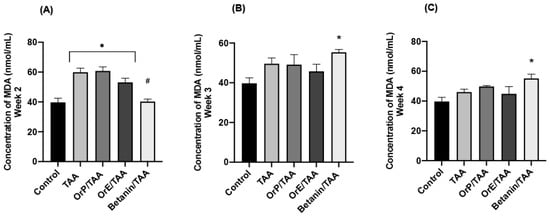 The excessive formation of superoxide radicals caused by TASO2 leads to the oxidation of unsaturated membrane lipids and the subsequent formation of MDA, which forms adducts with DNA, eventually triggering cell death. Likewise, lipid peroxidation of the cell membrane of hepatocytes is one of the main causes of liver injury [65]. Accordingly, in Figure 6A–C, we show that in our experimental model there was an increase in MDA throughout the treatment with TAA from week 2 onwards. High doses of TAA are known to induce oxidative stress and lipid oxidation as well as a decrease in antioxidant status [66].
