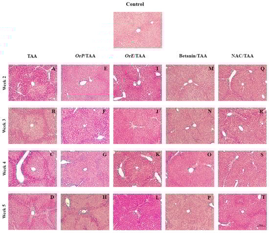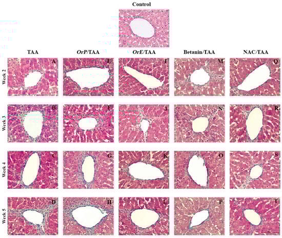 Damage projections from zone 3 to portal spaces. (A–D) Treatment with TAA showed extensive areas of vacuolation, necrosis, and fibrosis. Concomitant treatments decrease the severity of the damage. (E–H) OrP delays the morphological changes of the fibrotic process generated by TAA. (I–T) OrE, Betanin and NAC decrease the fibrotic process in all weeks of treatment. Masson’s trichrome staining. Magnification (100×).