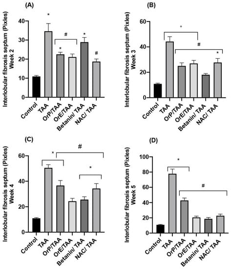Measurements of interlobular fibrotic septa for the different treatments at different time points. (A–D) In all the evaluated weeks of treatment, OrP and OrE significantly decrease the thickness of the fibrosis septa. One-way ANOVA with Tukey’s post hoc test. * p < 0.05 compared to control group, # p < 0.05 compared to TAA group.