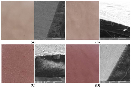 Figure 1 shows the microstructure of the β-glucan/bilberry juice films in the cross section at 1 kx to analyze the differences between surfactant and non-surfactant samples and to observe potential microcracks. As can be seen, on the transverse section, the samples with 2% surfactant (Figure 1B,D,G) showed a more compact surface, while the remaining samples present porous surfaces with micropores. The presence of pores makes the film less efficient in the water vapor barrier performance.