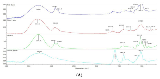ATR−FTIR spectra: (A) Individual FT−IR spectra for pure samples of BG, BJ, GLY, SA; (B) FT−IR spectra of the β-glucan/bilberry juice film samples (4000−650 cm−1).