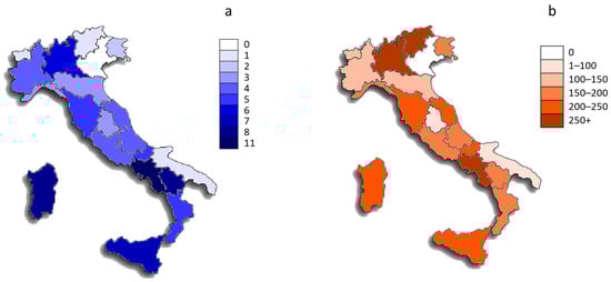 Maps showing the number of ethnobotanical studies that included medicinal applications (a) and the number of wild and cultivated plant species used for medicinal purposes (b) at the Italian regional level.
