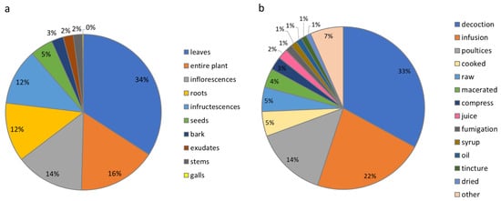 The plant organs that were used most for the medicinal preparations (Figure 2a) were the leaves (34%); entire plant (16%), generally referring only to the aerial parts, including buds and branches; inflorescences (14%) (whole or specific parts, such as petals, stamen, etc.); infructescences (12%); and roots (including tubers, rhizomes, bulbs) (12%). Seeds and their processed parts, such as flour, were used for 5% of the preparations while the remaining 7% of medicinal remedies were based on bark, bulbs, stems, latex, or other plant parts (Figure 2a).