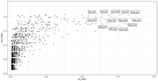 Graphic distribution of the cited medicinal species according to the citation (CI) and use (UI) indexes. To avoid overlapping, dots above 0.8 UI were randomly scattered on the y-axis (±0.1) using the R function geometry_jitter. In green, most relevant species with a CI above 0.6 and UI above 0.8 are shown. Malv_sylv, Malva sylvestris L.; Samb_nig, Sambucus nigra L.; Urti_dio, Urtica dioica L.; Matr_cham, Matricaria chamomilla L.; Cyno_dact, Cynodon dactylon (L.) Pers.; Rosm_offi, Rosmarinus officinalis L.; Bora_offi, Borago officinalis L.; Cich_inty, Cichorium intybus L.; Olea_euro, Olea europaea L.; Hype_perf, Hypericum perforatum L.; Salv_offi, Salvia officinalis L.; Laur_nobi, Laurus nobilis L.; Foen_vulg, Foeniculum vulgare Mill.