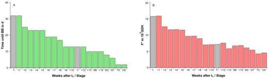 (A) Time until beginning of cherry blossom (BB) in days (d) and (B) forcing requirement between sampling and blossom (F* in GDH) for weekly sampling dates after t1 under controlled conditions (∼24 °C, 12 h light, 70% relative humidity), 2018/19 season. t1: endodormancy release, t1*: beginning of ontogenetic development. With beginning of bud development, sampling was done with development orientated at SB: ‘swollen bud’, SG: ‘side green’, GT: ‘green tip’, TC: ‘tight cluster’, OC: ‘open cluster’.