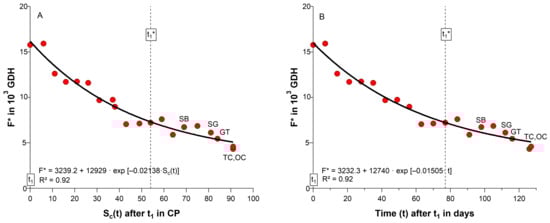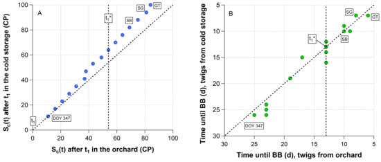 One common assumption is that additional chilling after endodormancy release reduces the forcing requirement until blossom. Table 2 already showed that during ecodormancy and ontogenetic development, temperatures in the orchard occur, which contribute to a further chill accumulation after t1. In the 2018/19 season, chill units raised from 40 CP at t1, to 94 CP at t1*, 109 CP at SB and 124 CP at GT. If we plot F* against the state of chilling Sc(t) from t1 until OC, a significant negative exponential relationship between the weekly chill and forcing accumulation exist (R2 = 0.92, p ≤ 0.01; Figure 2A), which is frequently realized in parallel phenology models, where chill units are accumulated during ecodormancy or even during ontogenetic development, in order to calculate the forcing requirement until blossom (Equation (1)). According to this approach, a lack of chilling could be compensated by additional forcing and vice versa.