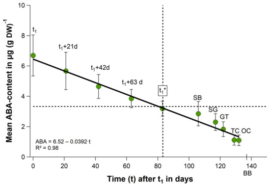 Each year from the beginning of October until ‘leaf fall’ in November, the ABA content in the buds raised, so that the maximum content was always observed during endodormancy phase (LF–t1). After endodormancy release in all seasons the value declined until ‘tight/open cluster’. On average there is nearly a linear reduction in the ABA content during this phase (Figure 4, Figure S3). The mean ABA content declined between t1 and t1* in 83 days (Table 1) from 6.69 ± 1.35 to 3.19 ± 0.49 μg/g DW at a rate of −0.042 μg/g DW per day by 52%. It further reduced from t1 until OC in 136 days to 1.10 ± 0.35 μg/g DW (83%). A similar reduction in the forcing requirement between t1 and t1* of 54% * was already stated in Section 2.3.