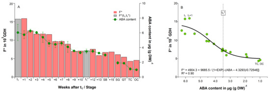 The declining forcing requirement until cherry blossom in the 2018/19 forcing experiment (Section 2.3, Figure 1B) was well correlated with the bud’s ABA content at sampling (r = 0.92, p ≤ 0.01, Figure 5A). Figure 5B shows a sigmoid relationship between the forcing requirement of buds until blossom (F*) and the bud’s ABA content at sampling (R2 = 0.90, p ≤ 0.01). The decline of F* seems to be stronger for twigs, which were sampled during ecodormancy, compared to them taken during ontogenetic development (t1*–BB). This would support the relatively constant forcing requirement between t1* and BB (Table 2). Here, it must be considered that after t1*, the development of the buds has started and thus the heat requirement until flowering necessarily decreases stepwise.