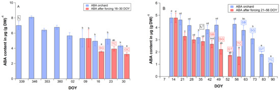 (A) Weekly ABA content of ‘Summit’ cherry flower buds (A) between endodormancy release (t1 = 339 DOY) and 30 DOY in the orchard (blue bars) and between 9 and 30 DOY under forcing conditions (red bars, ∼24 °C, 12 h light, 70% relative humidity) in 2019/20, (B) between 14 and 90 DOY in the orchard (blue bars) and between 14 and 56 DOY under forcing conditions (mean weekly temperature 8.0–12.0 °C, red bars) in 2013/14. t1*: beginning of ontogenetic development, SB: ‘swollen bud’, SG: ‘side green’, GT: ‘green tip’, TC: ‘tight cluster’, OC: ‘open cluster’. Error bars show the standard deviation of the repetitions (n = 3). Different letters indicate significant differences within the orchard and forcing experiment, ANOVA, Tukey-HSD test (p ≤ 0.05), DOY: day of year.