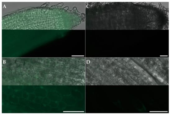 Fluorescence microscopy pictures of the root tip (A) and leaf segment (B) of a transgenic perennial ryegrass (Lolium perenne L.) plant regenerated from the transformation of ‘Arolus’ seed-derived calli with GFP expression driven by the maize ubiquitin promoter (C801_GFP); root tip (C) and leaf segment (D) of an untransformed plant displaying no GFP expression. In all panels, the top part shows an overlay of GFP and brightfield channels and the bottom part GFP channel only. The scale bars indicate 50 µm.