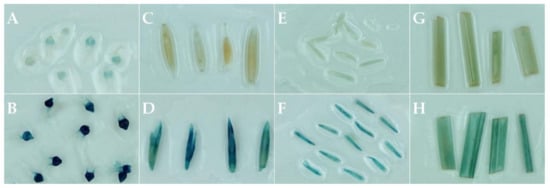 Flowering plants were assessed for GUS activity in leaf, spikelet, stigma, and anther tissue. The GUS activity was determined by incubating tissue samples in GUS assay solution (50 mM NaCl, 1 mM Tris, 1 mg·L−1 X-Gluc (Thermo Fisher Scientific, Waltham, MA, USA) and 0.1% (v/v) Triton X-100) for 12 to 16 h. The samples were then washed and de-stained multiple times with 70% (v/v) ethanol.