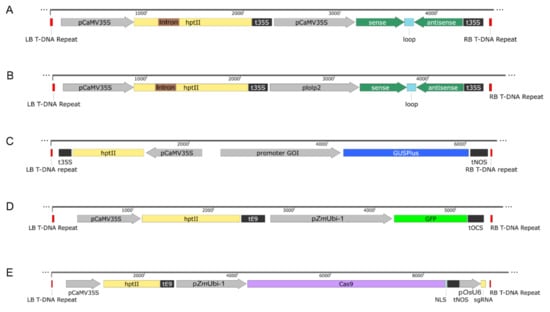 Structural organization of the T-DNA of the binary vectors for Agrobacterium-mediated plant transformation used in this study. All constructs (A–E) contained a hygromycin B resistance (hptII) for plant selection. (A,B) Composition of the hairpin-based RNAi (G150-G159) constructs where the hairpin targeting the gene of interest (GOI) was either driven by a CaMV 35S promoter (A: G150, G152, G154, G156, and G158) or by the lolp2 promoter (B: G151, G153, G155, G157, and G159). The ten hairpin-based RNAi constructs harbored a CaMV 35S terminator signaling the termination of the transcription. (C) Composition of the promoter-GUS expression constructs harboring the promoter region of the GOI fused to GUS (G160-G164) with a NOS terminator. (D) Composition of the GFP construct with a maize ubiquitin promoter (pZmUbi-1) driving the expression of the GFP with an tOCS terminator. (E) Composition of the CRISPR constructs (B330_MUTE_2 and B330_ETO1_807) with pZmUbi-1 driving the expression of the Cas9 fused to a nuclear localization signal (NLS). The transcription was terminated through a NOS terminator. The single guide RNA (sgRNA) that defined the genetic target for modification, either LpMUTE or LpETO1, was driven by a rice U6 promoter (pOsU6). The left (LB) and right border (RB) of the T-DNA region is displayed (LB T-DNA repeat and RB T-DNA repeat).
