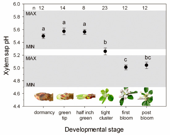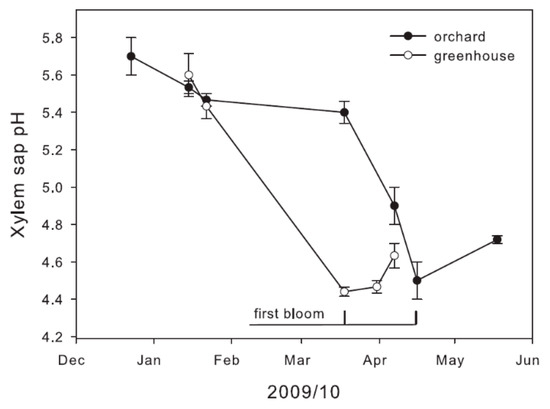 The pH of the xylem sap (pHx) of plants ranges from acidic values of 4.5 to about 7.4 [1], which is in contrast to the milieu of the symplast, which has an alkaline pH ranging from 7.2 to 7.5 [2]. Only a few studies report on seasonal changes of pHx. In deciduous temperate trees, xylem sap usually becomes more alkaline in winter and then acidifies during spring [3,4,5,6,7,8,9]. In contrast, it can also be the other way round, as in Juglans regia pHx acidifies during winter and becomes more alkaline in spring [10].