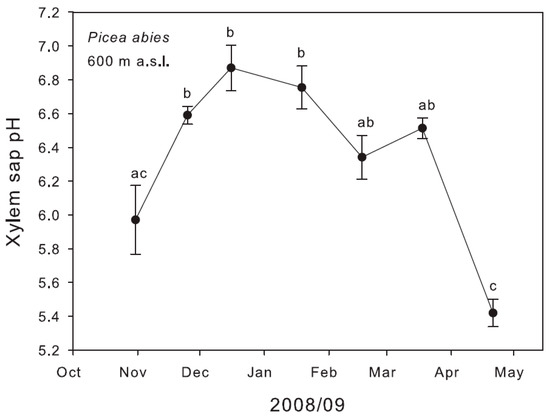 Seasonal change of pHx of twigs of P. abies sampled in the Botanical Garden in Innsbruck at 600 m a.s.l. Different letters indicate significant differences between mean values (±SE; n = 5) tested by ANOVA and the Bonferroni test at p < 0.05.